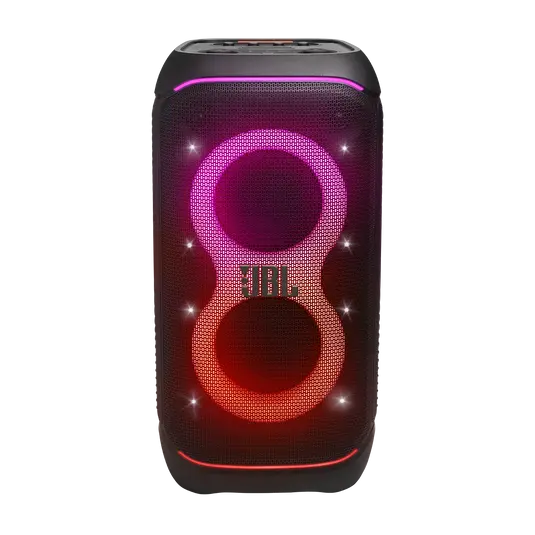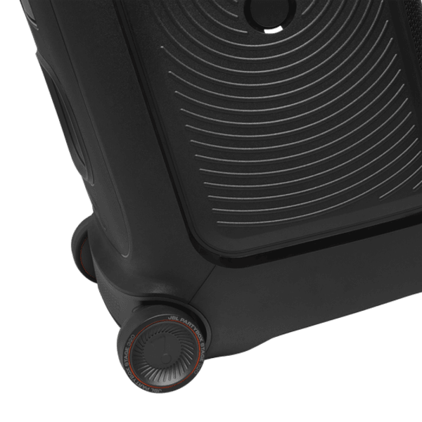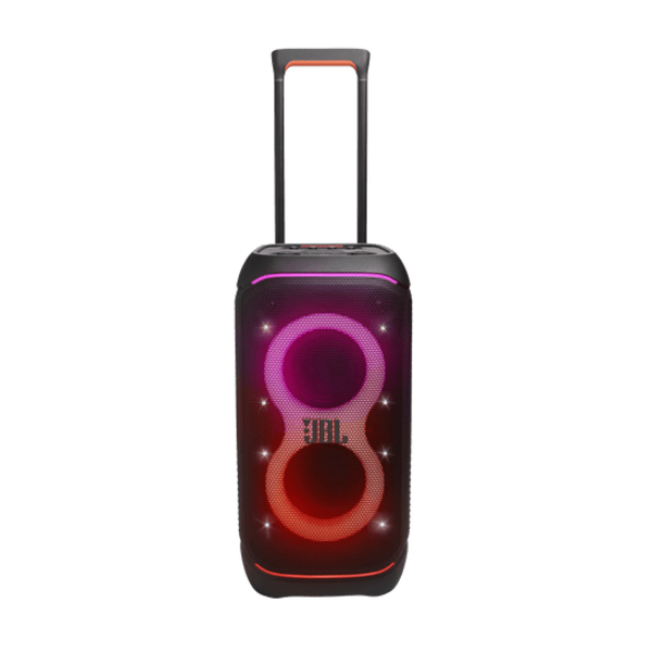 With the JBL PartyBox Stage 320, you can get the party started anytime, anywhere. Transform any space, inside or outdoors, into a dance floor. Powerful JBL Pro Sound and big thumping bass fill a wide soundstage and get the crowd moving, while their eyes are delighted by an adaptive lightshow of swirling starry lights, cool light trails, and amazing strobe effects synced to your beat. Use the mic and guitar inputs to show off your stage presence. You can steer the party's flow throughout the night with fun interactive party effects. The solid telescopic handle and wide, sturdy wheels mean you can roll the JBL PartyBox Stage 320 just about anywhere, and once you're there, the splash-proof construction means a little rain won't ruin the fun. Best of all, it delivers up to 18 hours of playtime—and if the good times are still rolling, just swap out the replaceable battery and keep going. For an even bigger party, it's easy to connect or use the JBL PartyBox app to connect multiple JBL Auracast-enabled speakers wirelessly. Bring people together and elevate the experience with the JBL PartyBox Stage 320.